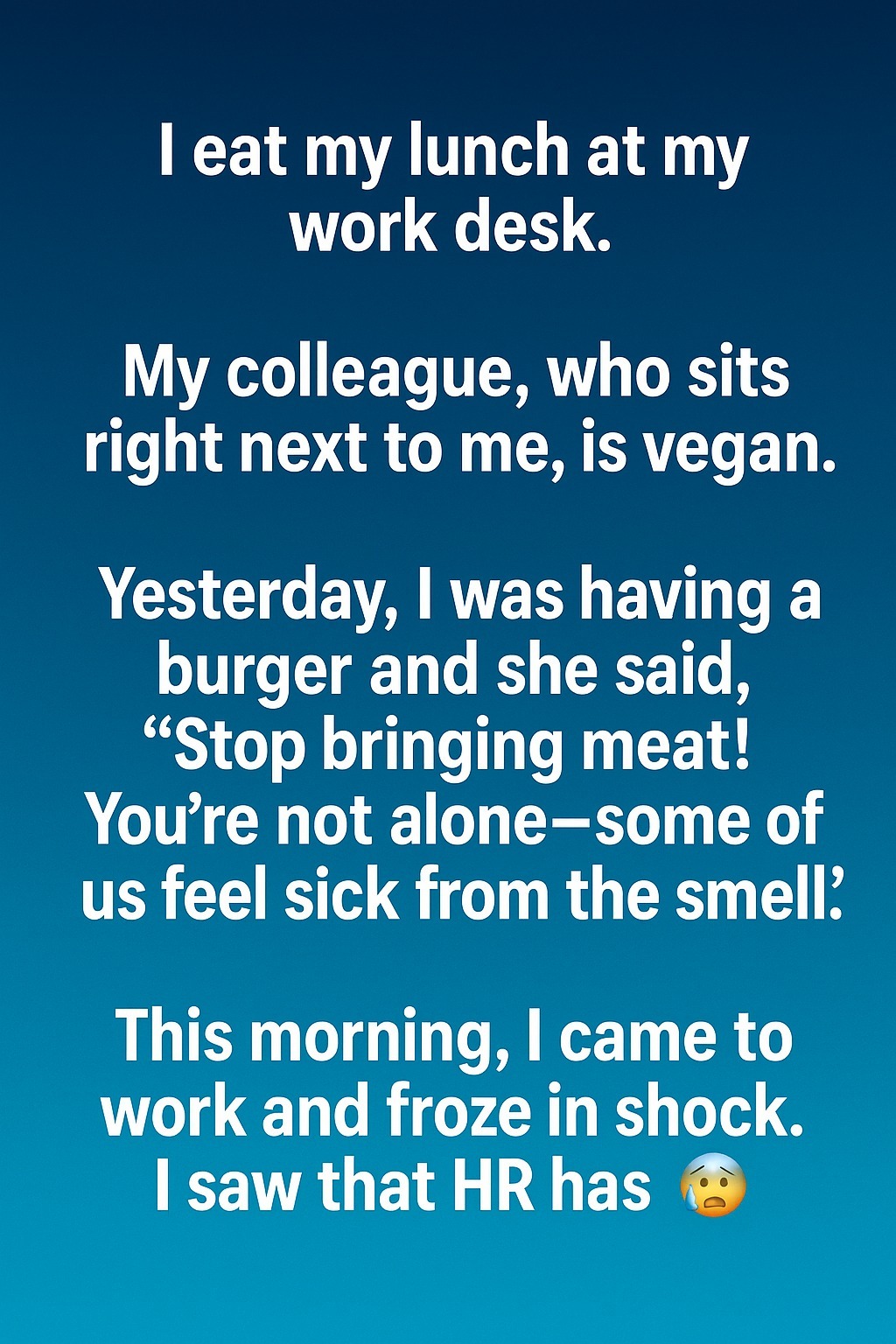 I (38F) eat my lunch at my work desk. My colleague, who sits right next to me, is vegan. Yesterday, I was having a burger and she said, “Stop bringing meat! You’re not alone here—some of us feel sick from the smell.”